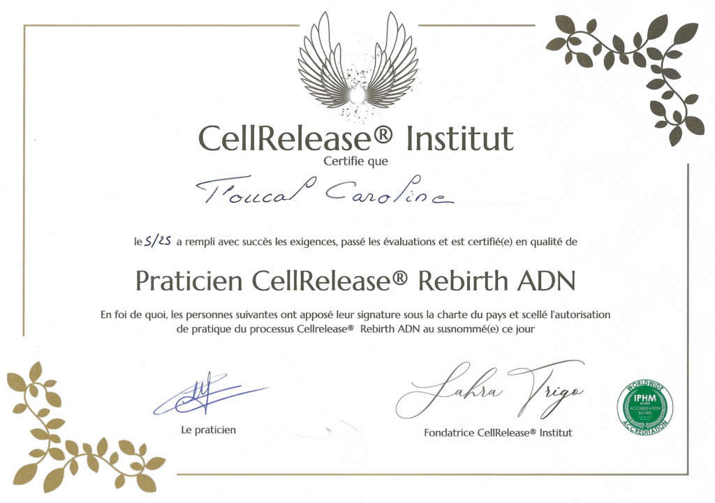 L’énergie de CellRelease®, permet de changer les vibrations cellulaires, amène à la libération des schémas hérités dans cette vie ou d’autres vies, et à la libération des émotions comme la culpabilité, la peur, la limitation, le vide… Les praticiens, et tous ceux à qui ils feront bénéficier leurs soins, viennent métamorphoser leur Univers ainsi que lignées ascendantes et descendantes.